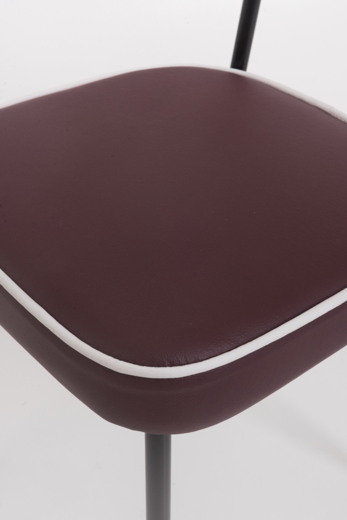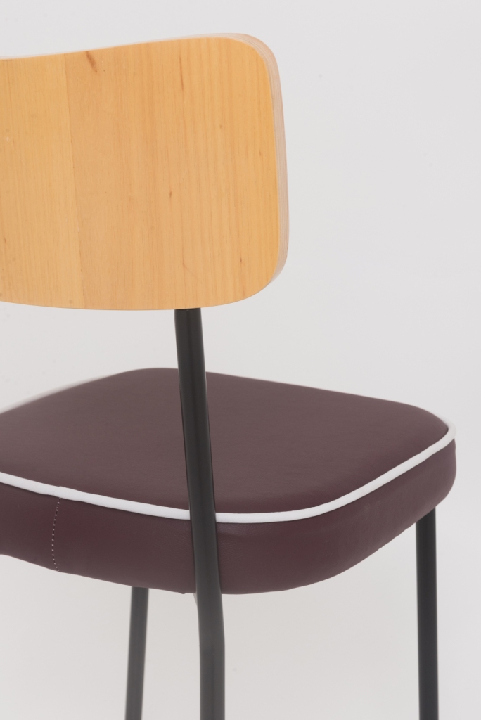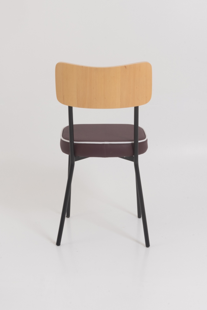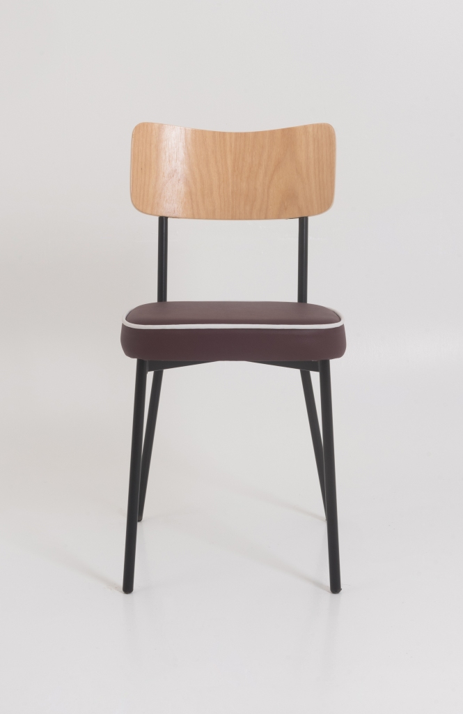 Cadeira estrutura tubo 3/4, pintura epóxi preto fosco, encosto de madeira tauari cor natural, com acabamento em verniz; assento espuma injetada 5cm, revestimento com debrum da mesma cor ou outra cor.