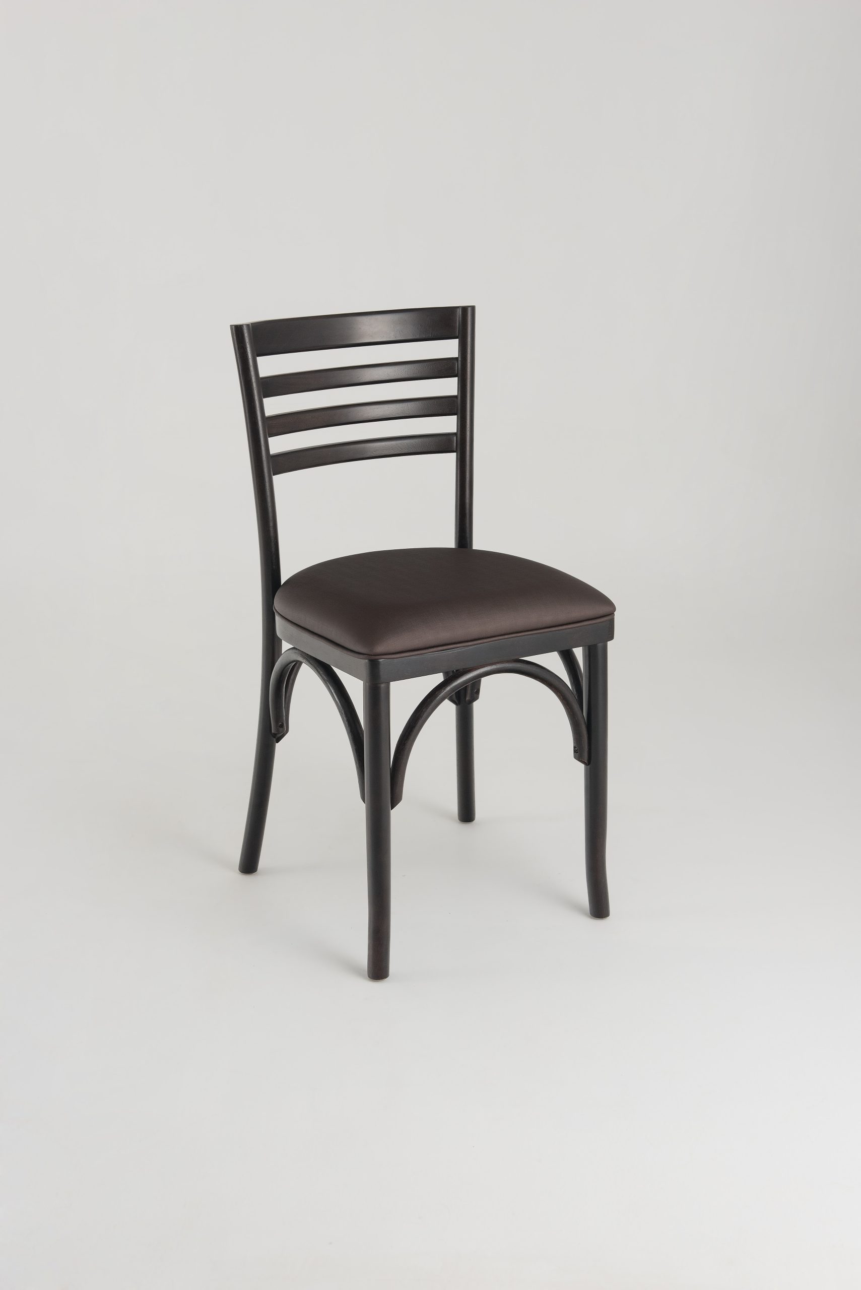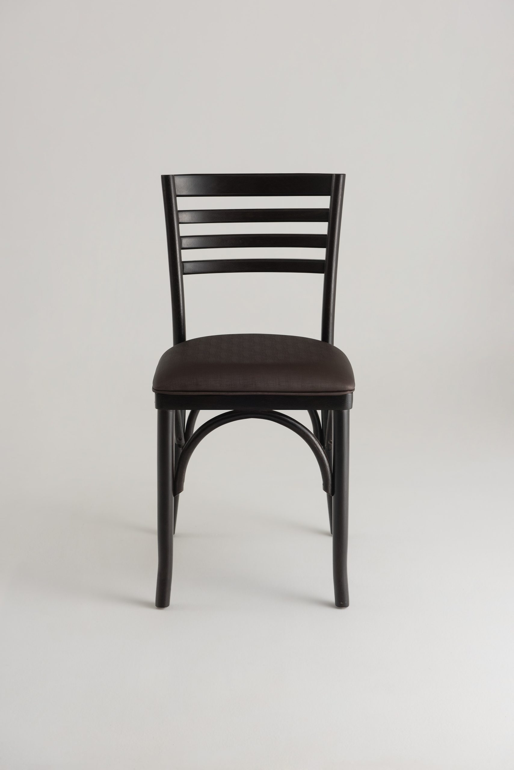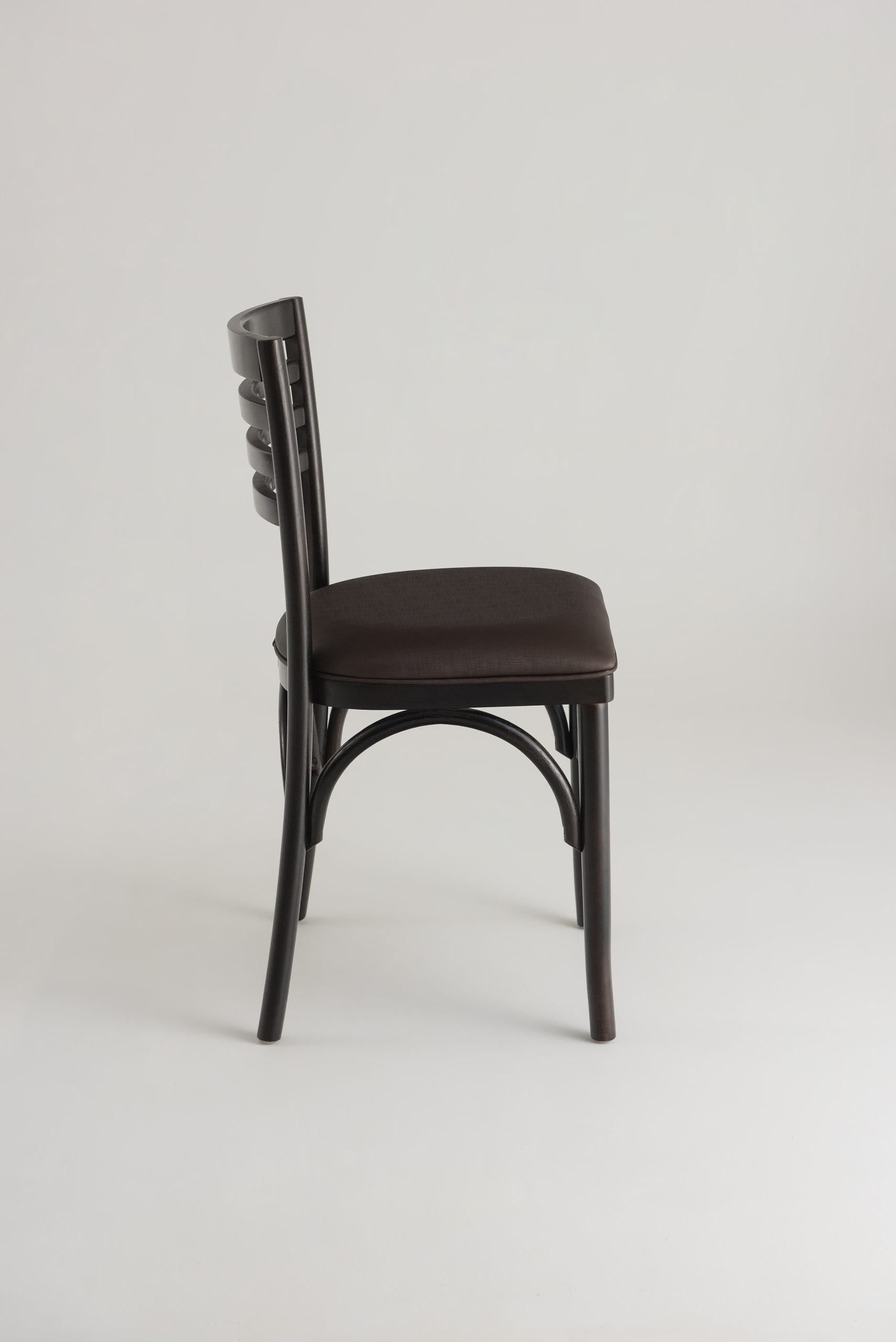 Cadeira de Madeira de Tauari, tingimento PU Verniz Cores Tabaco, Mel, Imbuia Escuro e Imbuia Claro. Assento estofado espuma laminada 3 cm D-28 revestimento em Corano ou Facto. Possui sapatas de PVC.