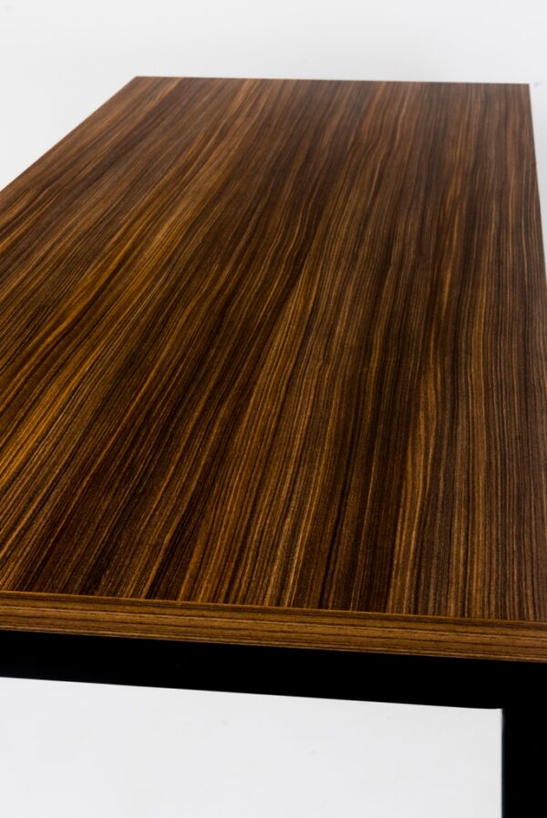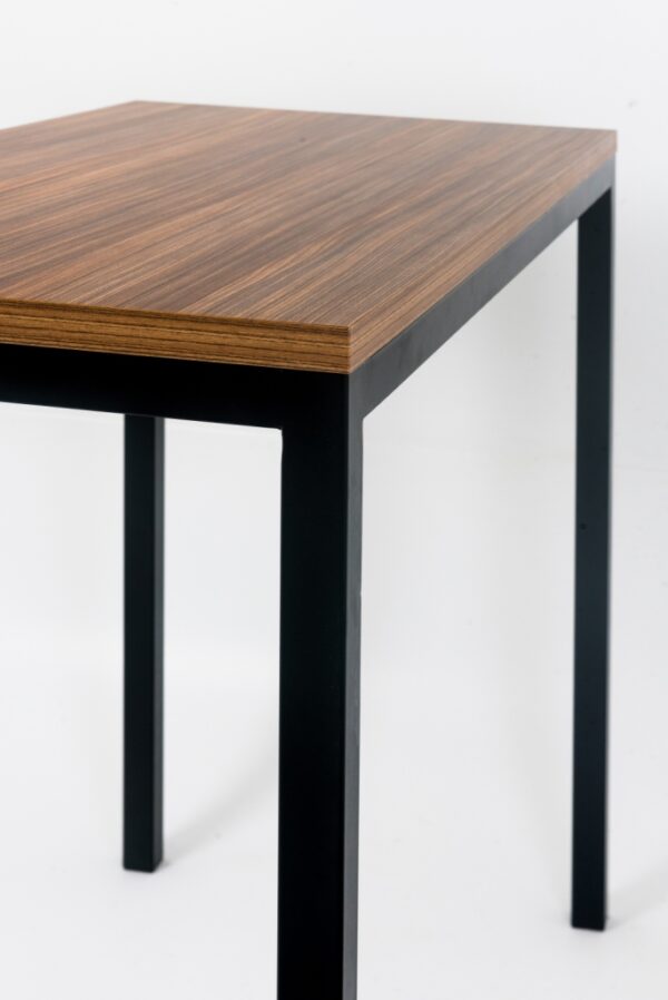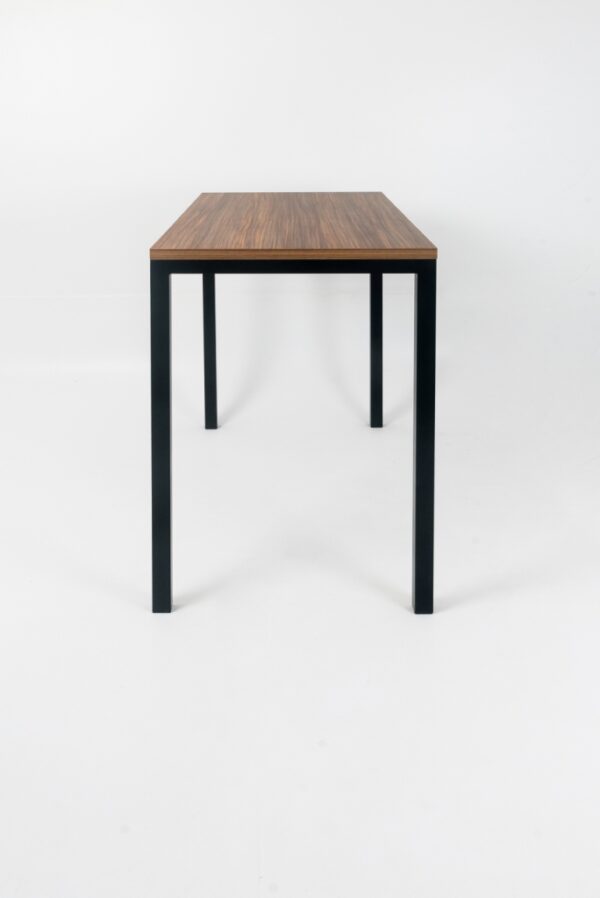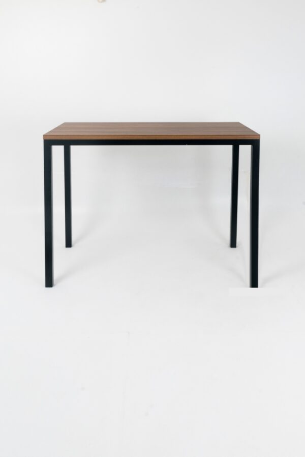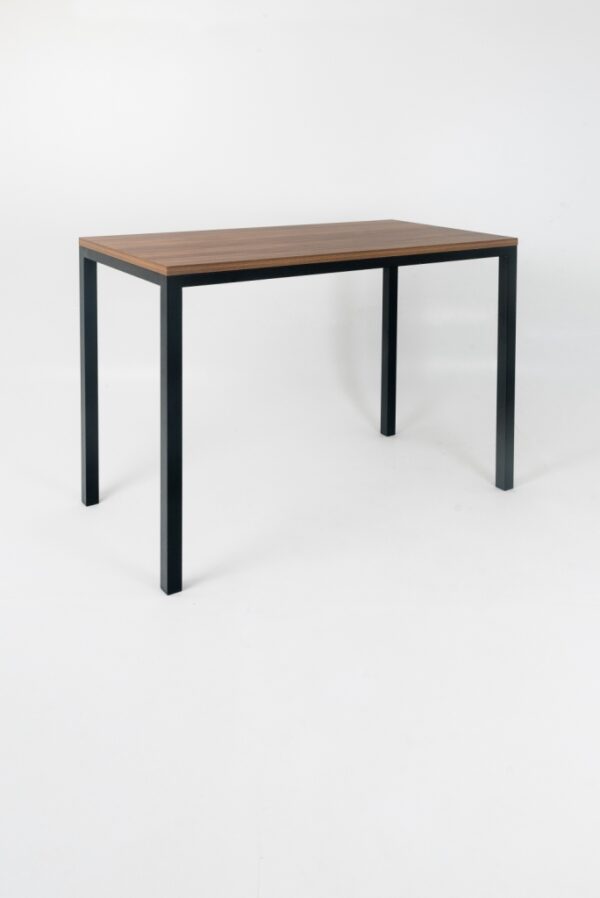 Mesa Retangular Alta com estrutura tubo em aço carbono 40×40, pintura epóxi, com ponteiras de pvc. Tampo 120×60 em MDF melamínico com borda engrossada acabamento fita.