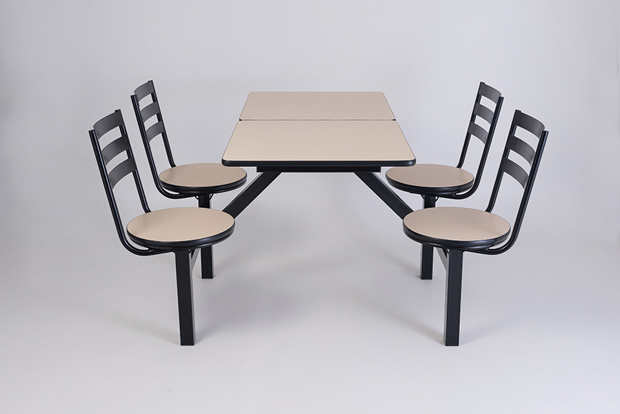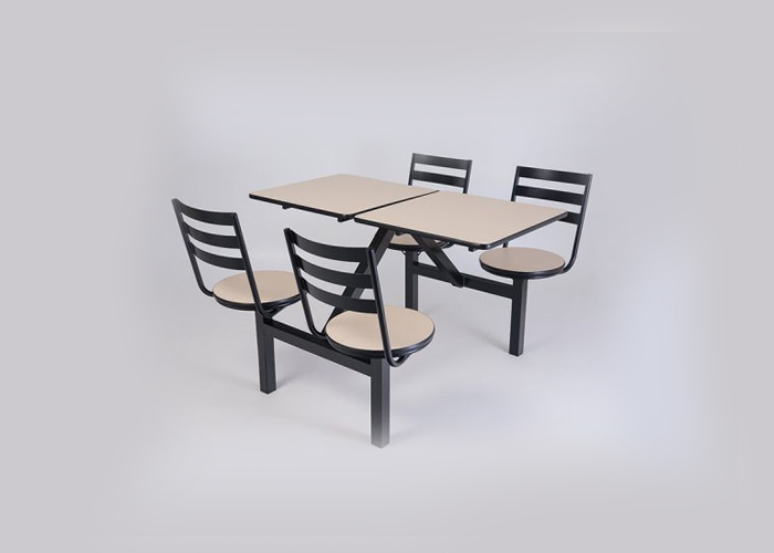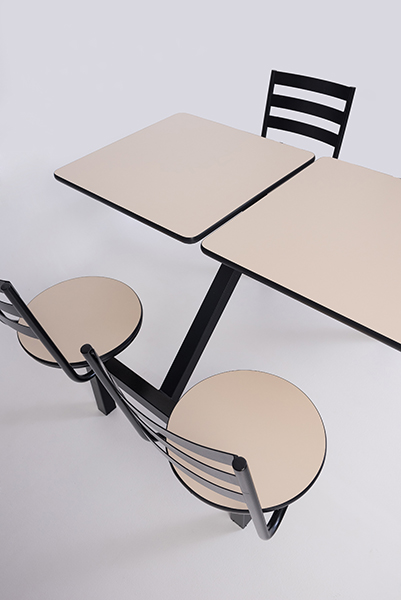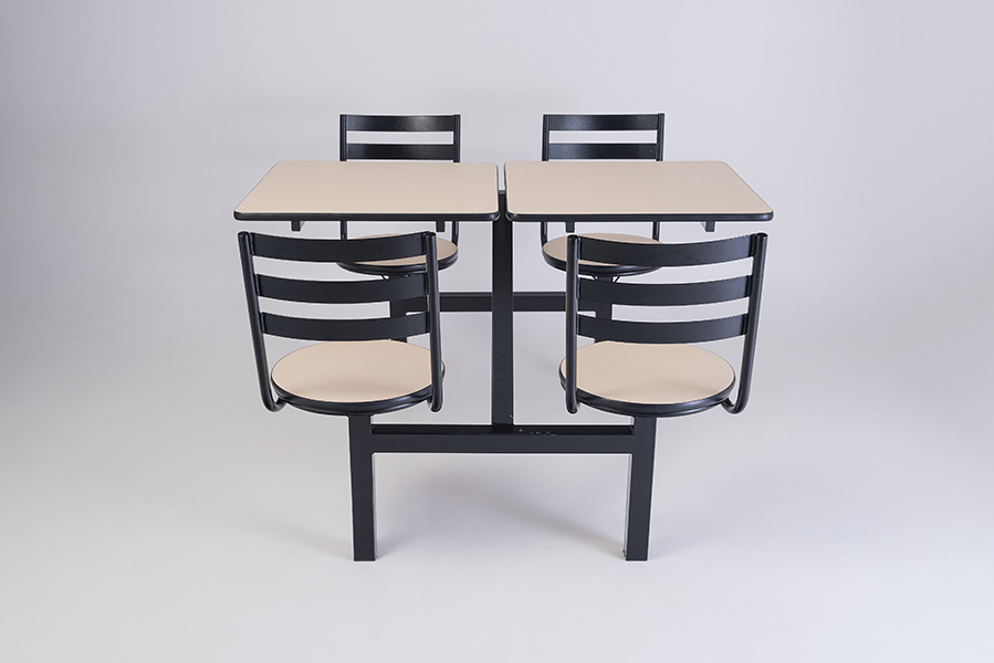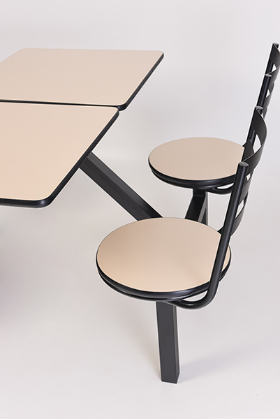 Praça de alimentação para quatro lugares com estrutura de aço carbono 50×50 pintura epóxi. Dois tampos em MDF 60×60, acabamento de bordas perfil pvc,  assentos fixo em MDF cores a definir .